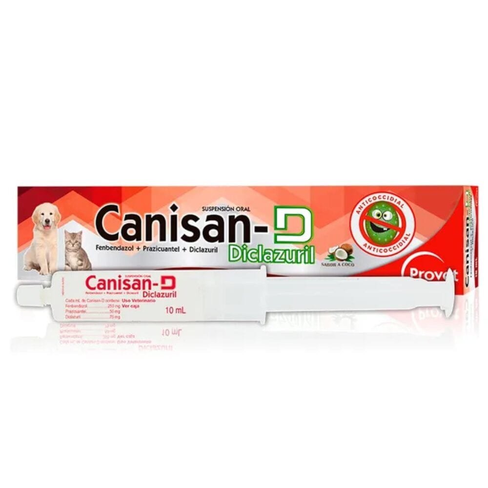 CANISAN®-D es un antihelmíntico – anto protozoario para el tratamiento y control de las principales parasitosis, coccidiosis y giardiosis, que afectan el sistema digestivo de perros y gatos. Su composición permite el control y tratamiento de Neosporosis y toxoplasmosis, y otros protozoarios involucrados en afectaciones nerviosas y reproductivas en los perros y gatos. CANISAN®-D En perros y gatos para el tratamiento y control de parasitismo ocasionado por: Toxocara canis, T. leonina, Ancylostoma caninum, Uncinaria stenocephala, Trichuris vulpis, Taenia pisiformis, Dipylidium caninum, Echinococcus granulosus, para tratar también infecciones por Capillaria aerophilia, Filaroides hirthi y Paragonimus kellicotti. Útil en el tratamiento y prevención de la coccidiosis por Cystoisospora canis, Cystoisospora felis (anteriormente conocido como Isospora canis y felis) y de las infecciones por coccidias extra intestinales como Neospora caninum y Toxoplasma spp. Es efectivo contra infecciones por Giardia intestinalis quísticas y activas (todos los genotipos de trofozoitos).